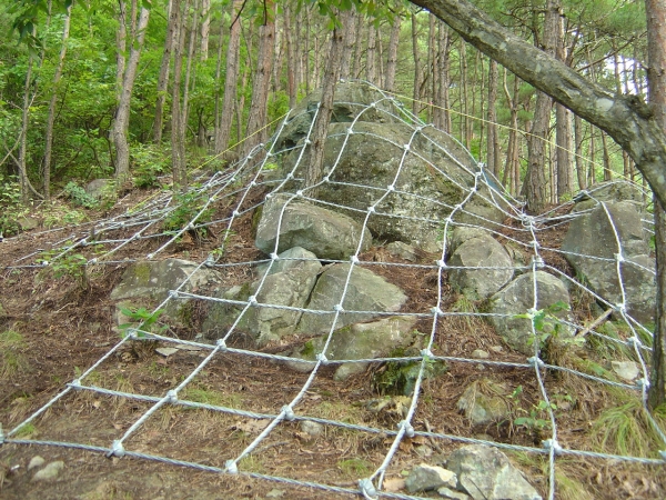 対象とする単体もしくは数個の浮石、転石に、格子状にしたワイヤーロープや数本のワイヤーロープを用いて、初期移動を抑止する工法です。また、大きな浮石、転石にも対応が可能です。