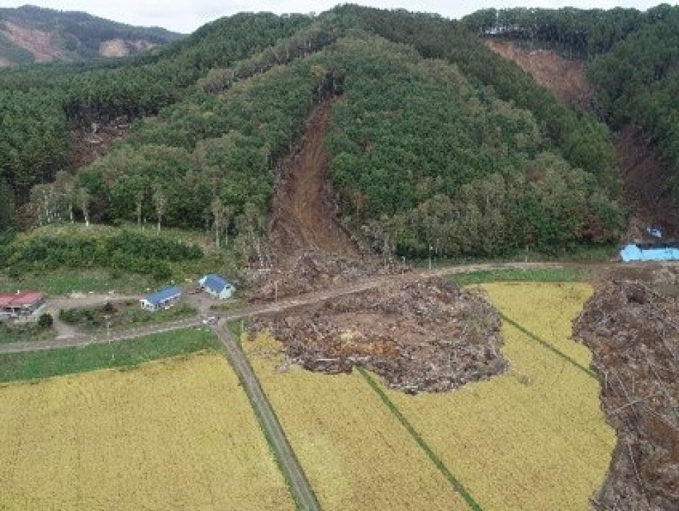 | 工事概要 | 当該施工地は、平成30年9月6日発生の地震により山腹崩壊が発生し、斜面下方の町道へ立木を含んだ土砂が流出し被災した。その際、町道は堆積した土砂により全面通行止めとなった。山腹内は不安定な土砂を残しており、今後の余震や降雨により再崩壊、流出の危険が極めて高い状況であり、新たな被害が懸念されることから、土留工・水路工・暗渠工・法枠工・実播工を施工して復旧整備を行った。 〇 鋼製土留工 2基 No.1土留工 L=41.0m H=3.0m W=15.28t No.2土留工 L=18.0m H=1.0m W=6.79t |
